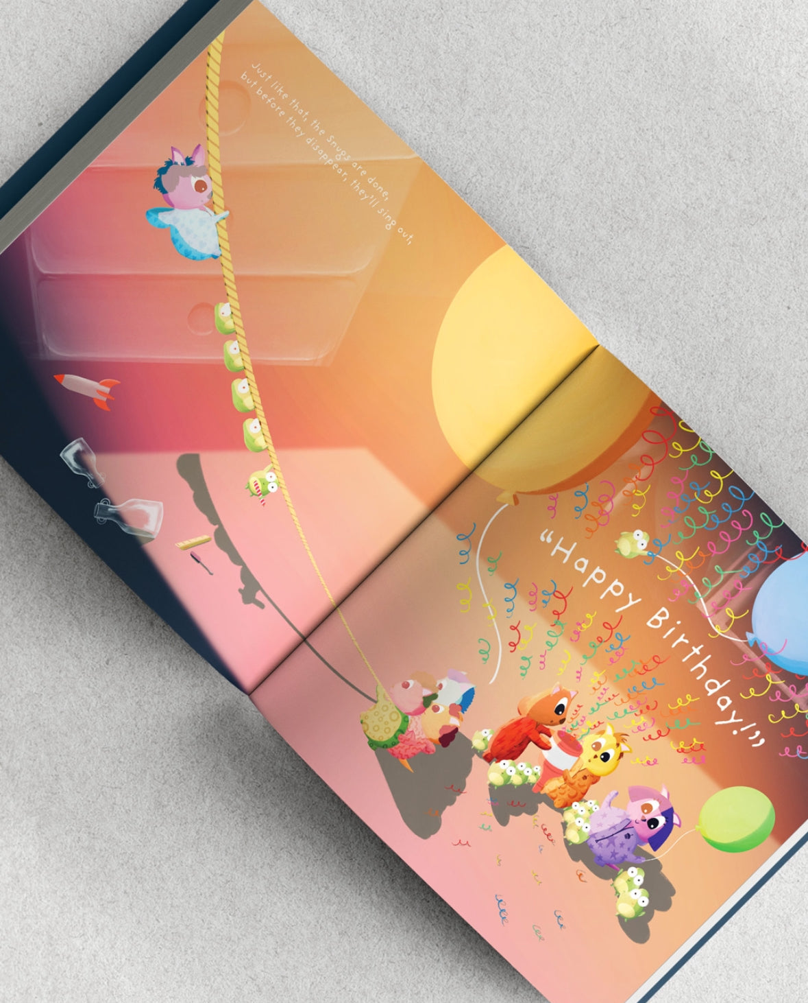As families gather to read the story, children are transported into a magical realm where Birthday Snugs come to life to make children a little taller, a little faster, and kinder.